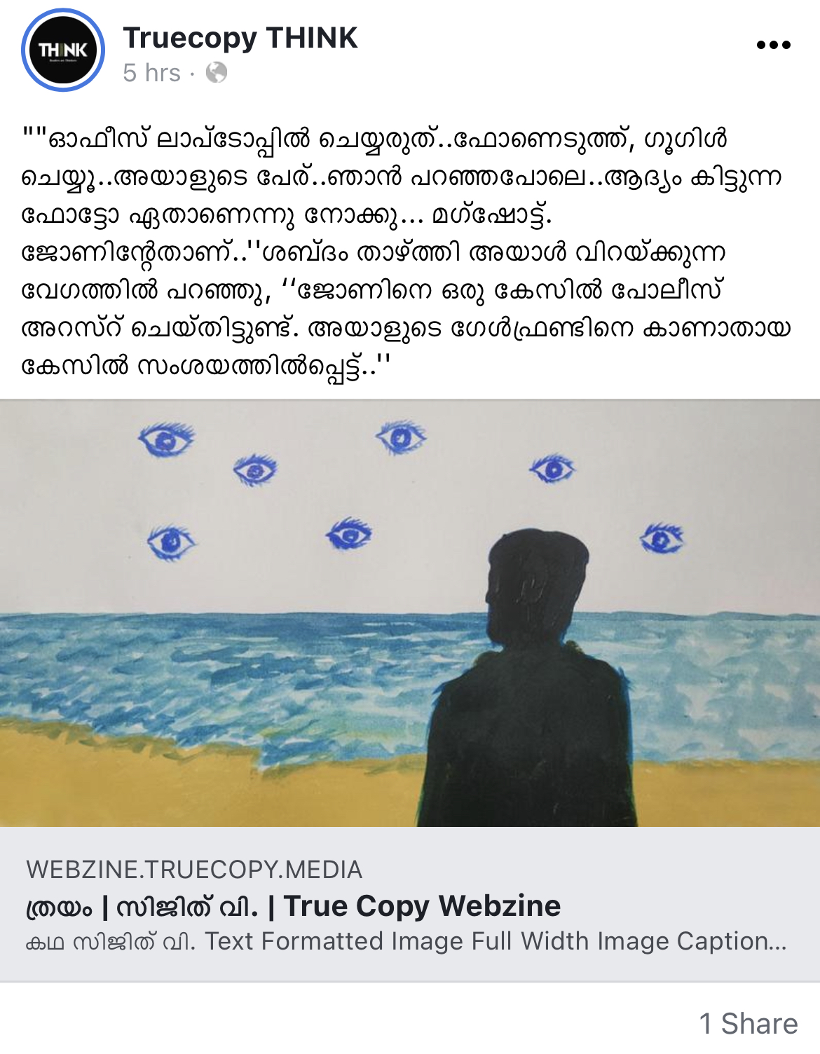 കഥ,മലയാളം കഥകൾ,Malayalam Podcast ത്രയം – ട്രൂ കോപ്പി തിങ്ക് വെബ്സീനിൽ പ്രസിദ്ധികരിച്ചത് Sijith_Kadhafactory on 04/04/202204/04/2022 സുഹൃത്തുക്കളെ, ത്രയം എന്ന കഥ ട്രൂ കോപ്പി തിങ്കിന്റെ വെബ്സീൻ മാഗസിനിൽ 71 മത് ലക്കം പതിപ്പിൽ പ്രസിദ്ധീകരിച്ചിരിക്കുന്നു.ലിങ്ക് ഇതോടൊപ്പം ചേർക്കുന്നു.ഓഡിയോ / ടെക്സ്റ്റ് വേർഷനുകളിലാണ് കഥ പ്രസിദ്ധീകരിച്ചിട്ടുള്ളത്. നന്ദി https://webzine.truecopy.media/paywall/1986/thrayam-story-by-sijith-v?fbclid=IwAR1xW-Q_L4OLAsbBFQeNiihFDNO64G7Wsu6K8IBQqxWwaBA1RogUVFOlcAY View this post on Instagram A post shared by Sijith Vijayakumar (@sijith_v) Share this: Click to share on Facebook (Opens in new window) Facebook Click to share on X (Opens in new window) X Like Loading...
